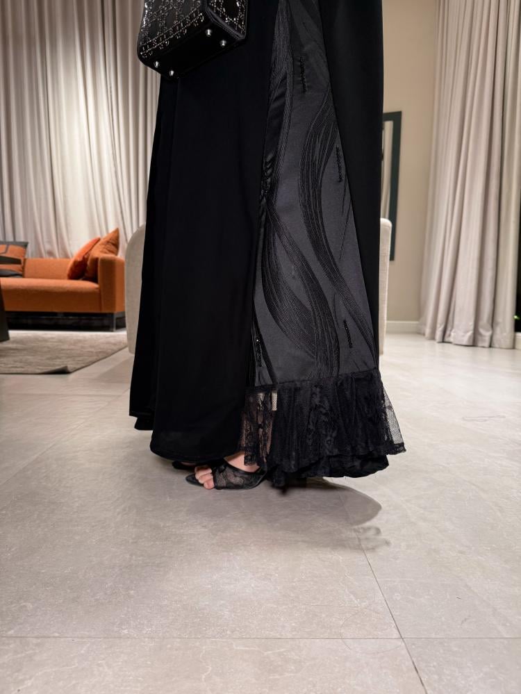 📝 وصف المنتج: نص كلوش بتدخيلات جاكار وشك اسود ودانتيل