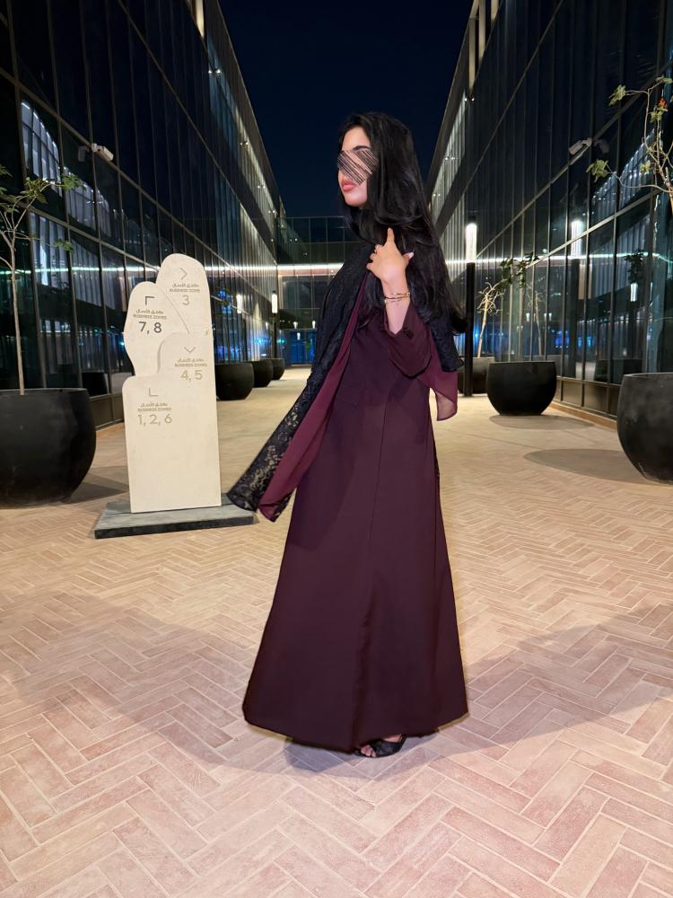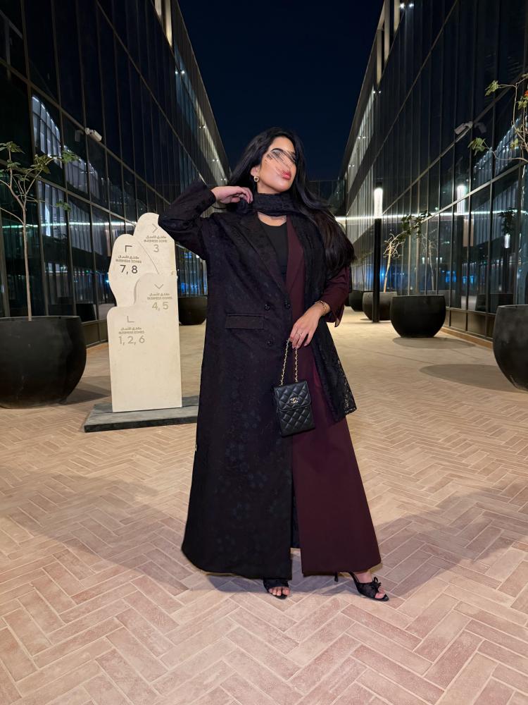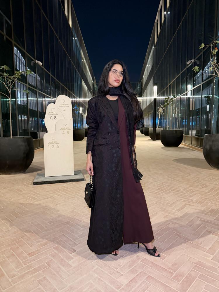 شكل الموديل / قصة بلايزر مع تدخيلات دانتيل وفتحه بسيطه اسفل العبايه من تتقفل بطقطق اثنين